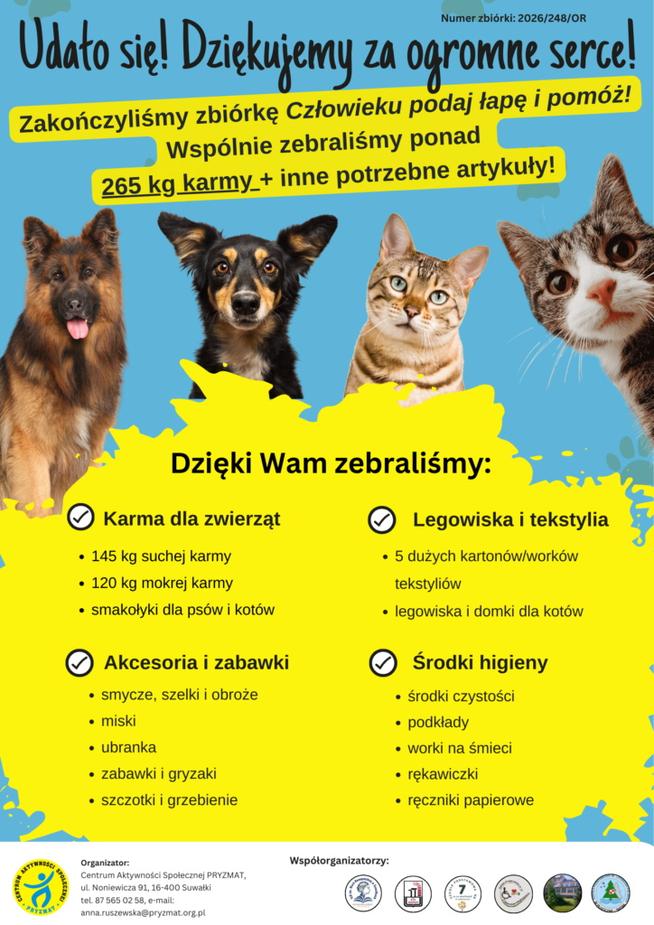 Dziękujemy każdemu, kto dorzucił choćby jedną „cegiełkę”. To dzięki Wam świat bezdomnych zwierząt stał się dziś odrobinę lepszy. Pamiętajcie – dobro wraca, a my już teraz szykujemy się do kolejnych wspólnych działań!